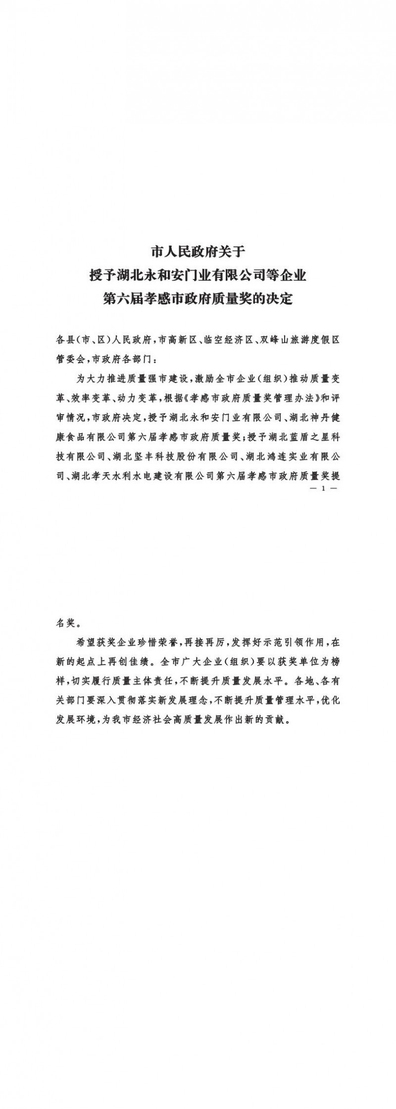 市人民政府關(guān)于授予湖北永和安門業(yè)有限公司等企業(yè)第六屆孝感市政府質(zhì)量獎的決定