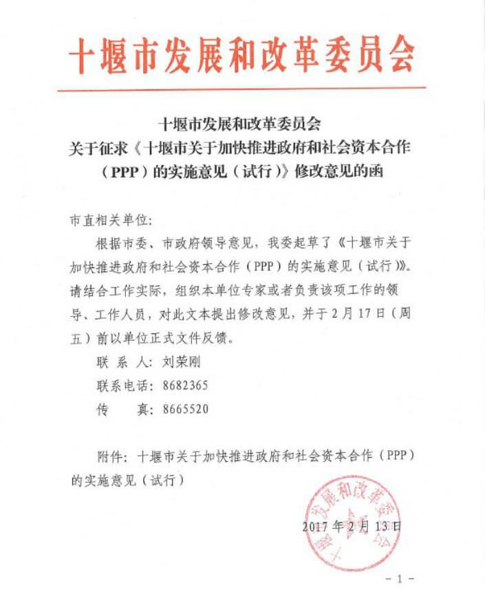 關(guān)于征求《十堰市關(guān)于加快推進政府和社會資本合作(PPP)的實施意見(試行)》修改意見的函