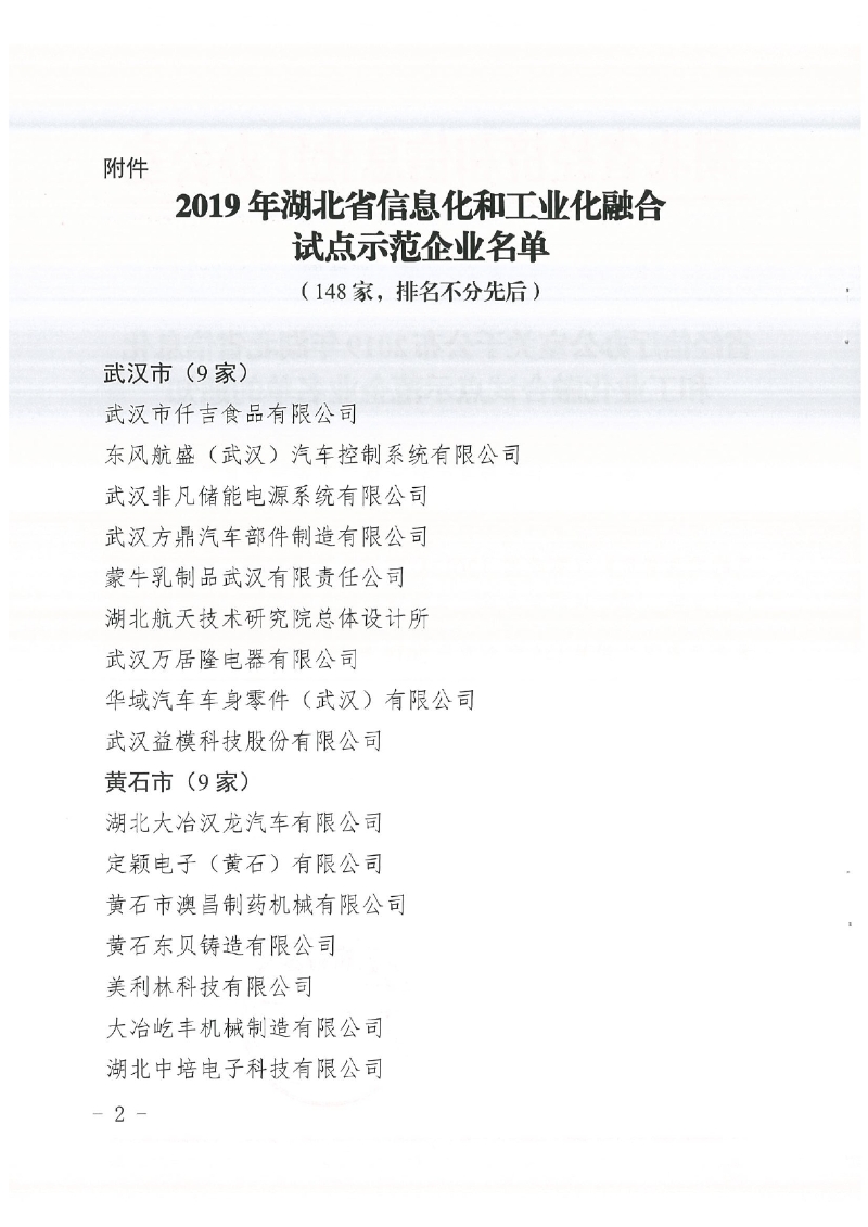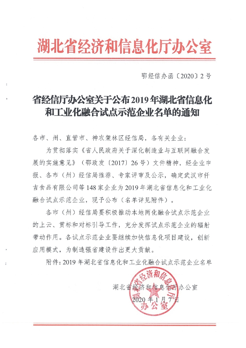 省經(jīng)信廳辦公室關(guān)于公布2019年湖北省信息化和工業(yè)化融合試點示范企業(yè)名單的通知