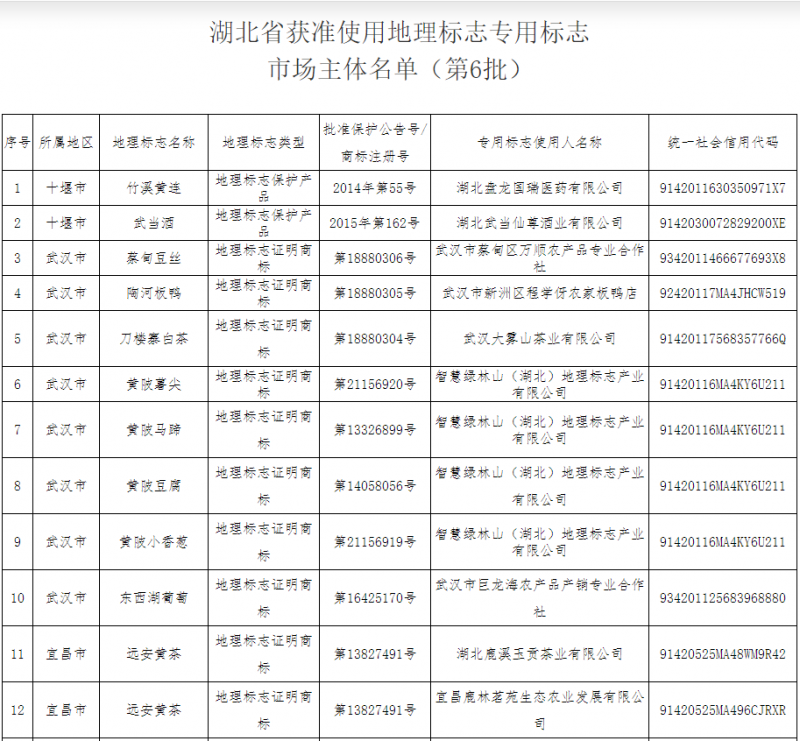附件:湖北省獲準(zhǔn)使用地理標(biāo)志專(zhuān)用標(biāo)志市場(chǎng)主體名單(第6批)