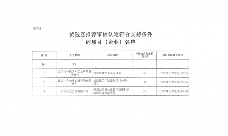 根據市經信局《關于撥付省級高質量發(fā)展專項資金及市級工業(yè)投資技改專項資金的通知》要求,經企業(yè)自愿申報,相關街鄉(xiāng)經發(fā)辦推薦,由市經信局委托相關審計機構對相關企業(yè)的申報材料進行了審核。經推薦審核認定,黃陂區(qū)有三家企業(yè)項目:武漢長江光電有限公司“新型數碼瞄關重部件精密機加智能制造改造項目”、武漢市神風汽車工業(yè)有限責任公司“精密模具制造車間改造項目”和武漢中車長客軌道車輛有限公司“智能化工廠改造升級(一期)項目”符合支持條件。