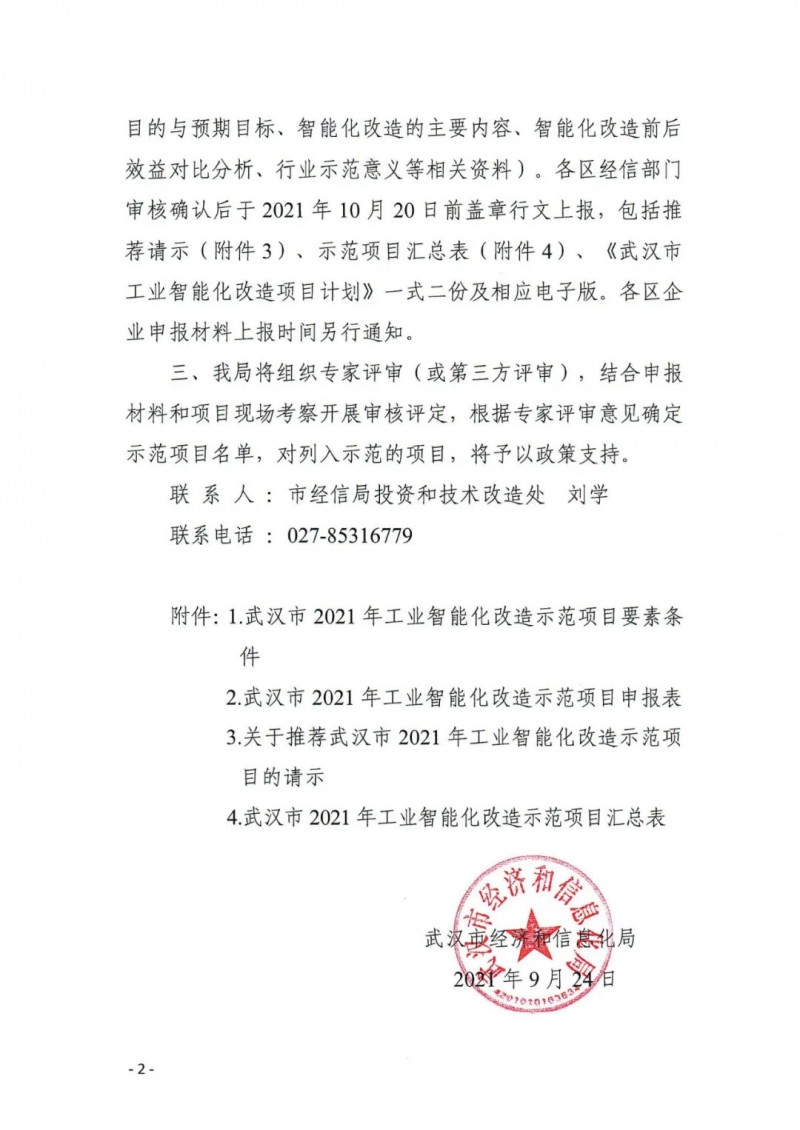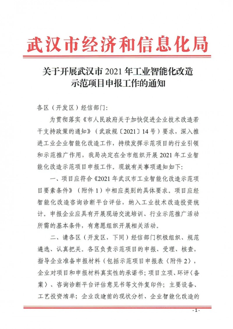 關(guān)于開展武漢市2021年工業(yè)智能化改造示范項(xiàng)目申報(bào)工作的通知